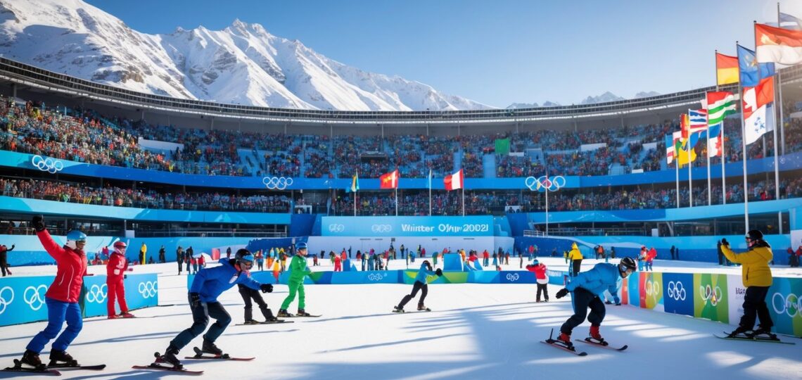 Stadion Olimpiade modern dengan penonton ramai, atlet berkompetisi dalam olahraga musim dingin seperti ski dan seluncur es, latar pegunungan bersalju dan langit cerah.
