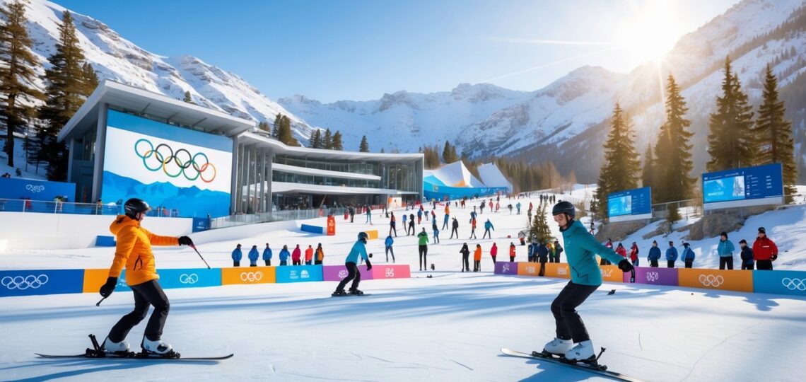 Pemandangan venue Olimpiade Musim Dingin 2026 dengan pegunungan bersalju, atlet olahraga musim dingin sedang bertanding, dan penonton di tribun.